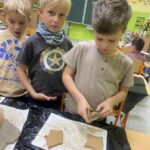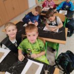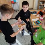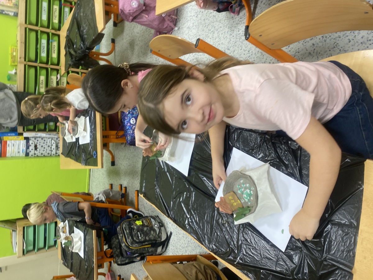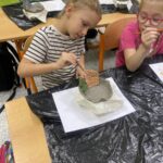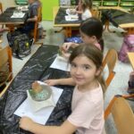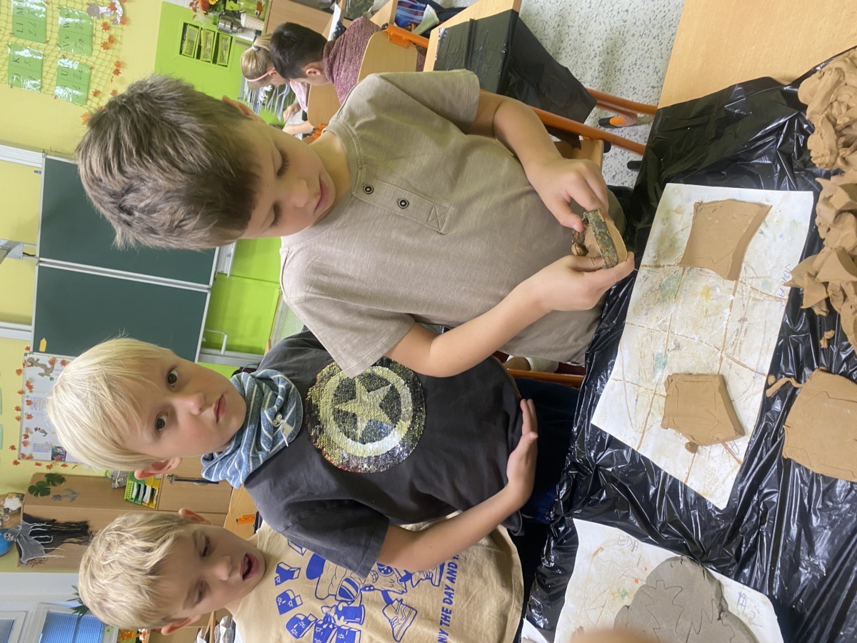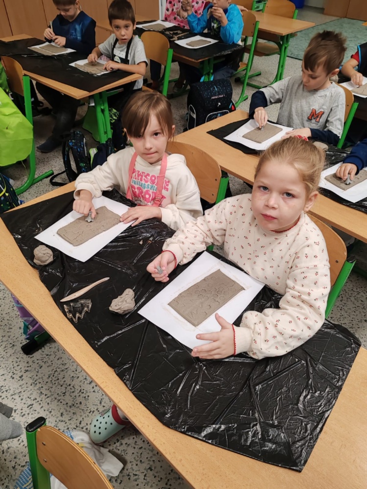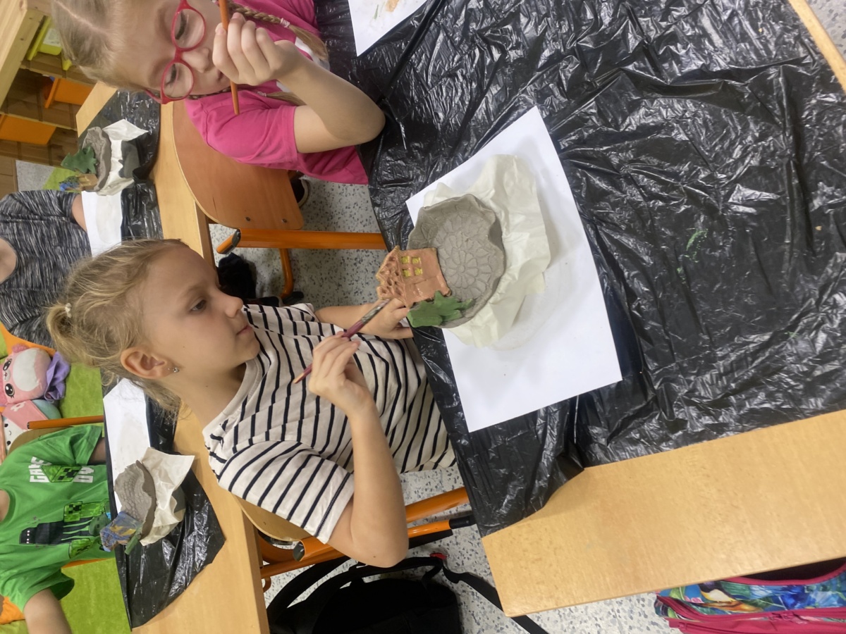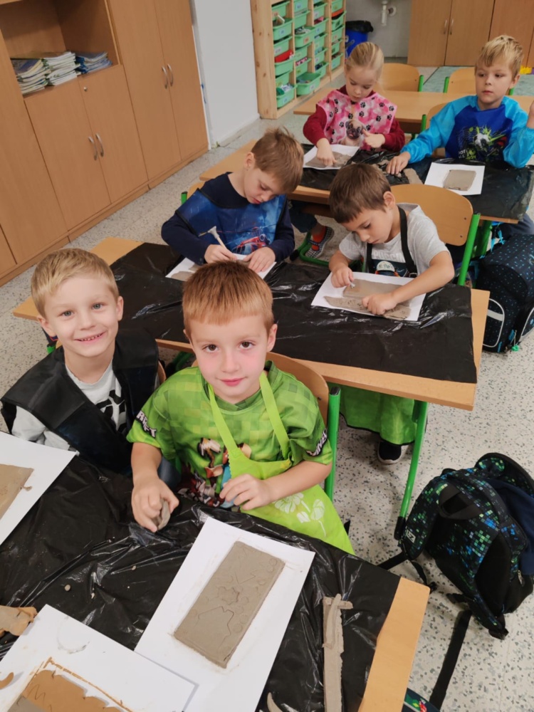V říjnu si někteří prvňáčci zkusili i poprvé práci s keramickou hlínou. Třídy se nám proměnily v keramické dílny a děti válely hlínu, kterou si následně vytvarovaly do mističek a ozdobily. Připojily stromeček a domeček, který si vyrobily pomoci vykrajovátek a následně barevně nabarvily. Děti se velmi snažily a za pomoci zkušené lektorky se jim práce skutečně dařila. Na hotový výrobek si ještě chvíli počkají, musí projít keramickou pecí a glazurováním, ale už teď se na něj těší.